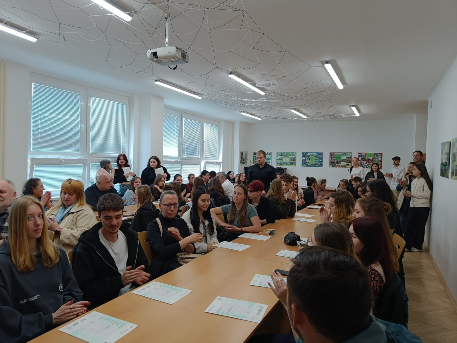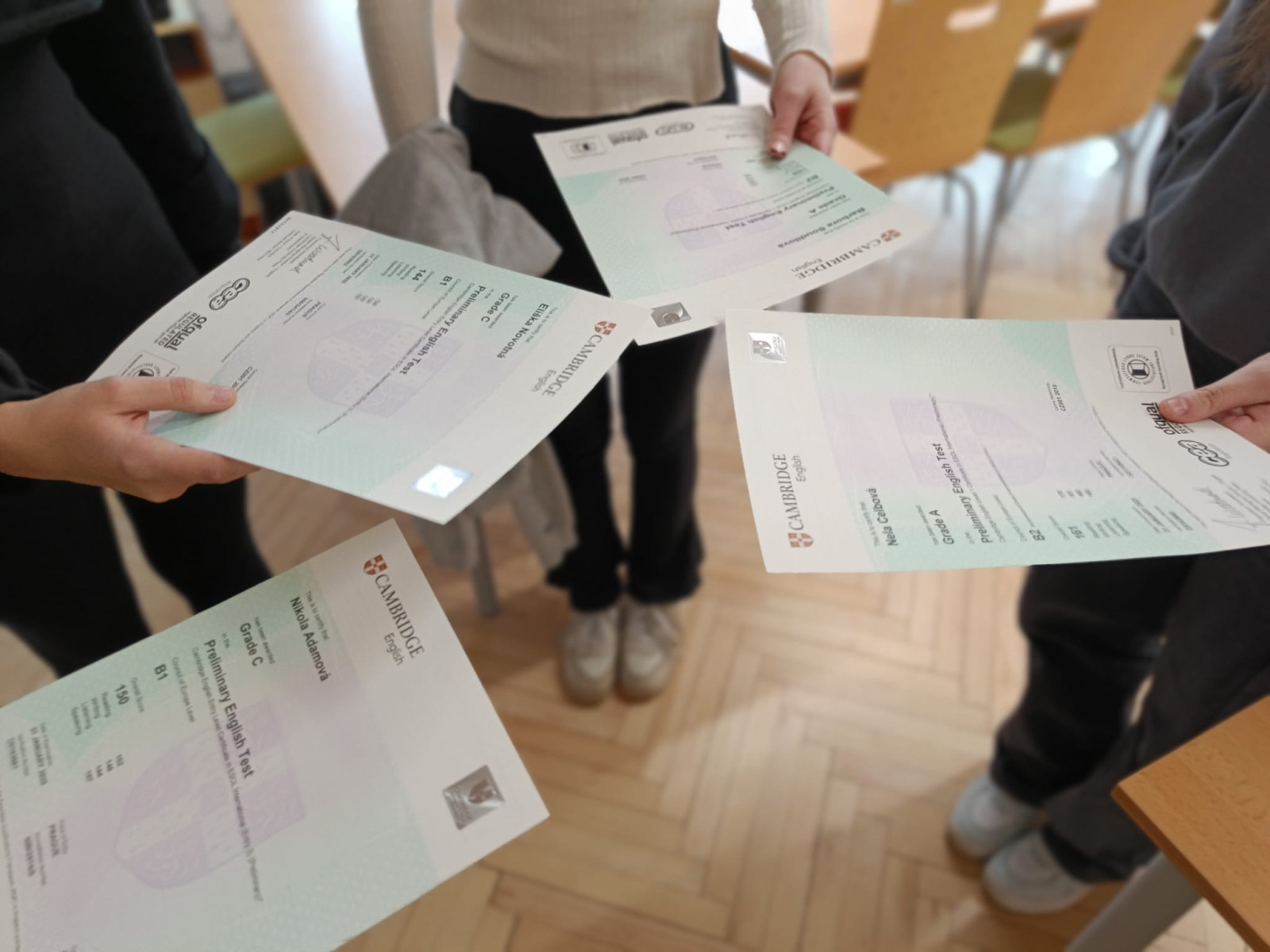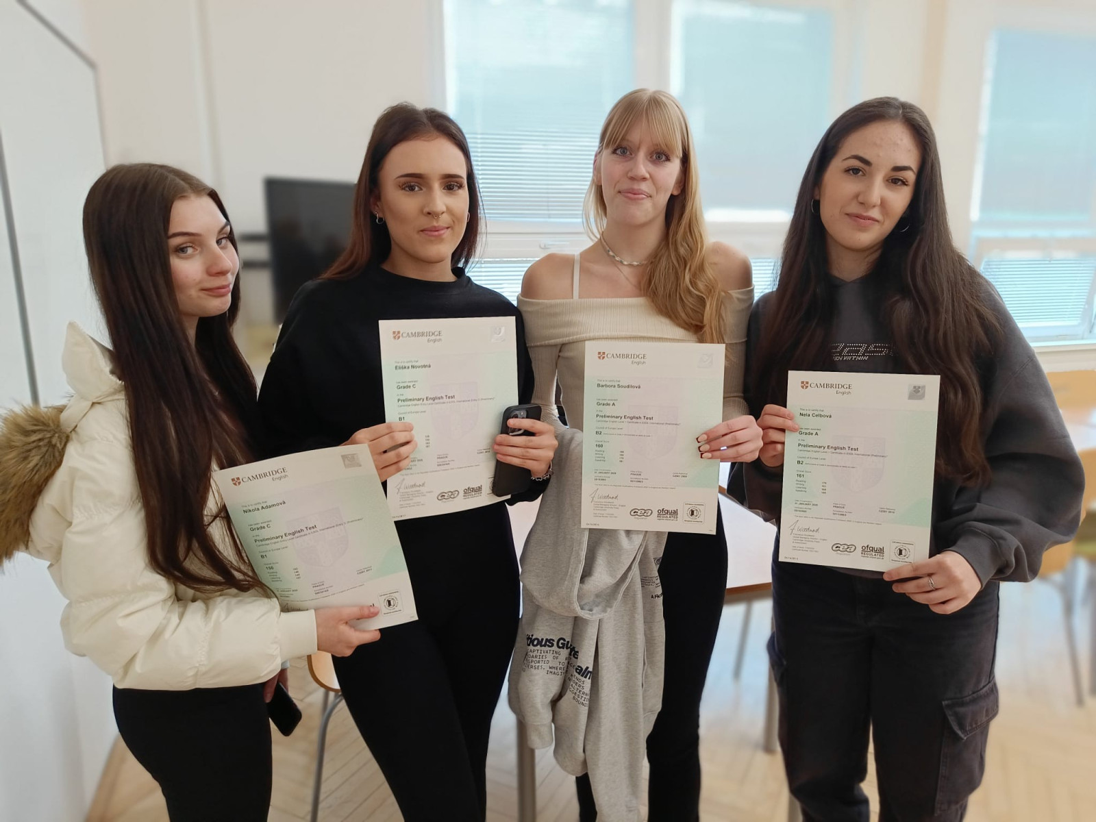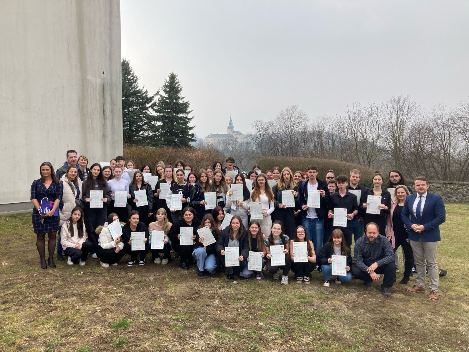 Ve středu 12. března proběhlo slavnostní předání certifikátů Cambridge, které úspěšně získalo 54 žáků naší školy. Ti o pololetních prázdninách absolvovali mezinárodní jazykovou zkoušku z anglického jazyka. Díky spolupráci s British Council, prestižní britskou organizací podporující vzdělávání a kulturu, se mohli žáci do tohoto programu zapojit přímo na naší škole. Celkem 49 žáků dosáhlo úrovně B1, přičemž 27 z nich obdrželo výsledky hodnocení B2. Dalších 5 žáků získalo certifikát na úrovni A2. Slavnostního předávání se vedle žáků druhého, třetího a čtvrtého ročníku studijních oborů Obchodní akademie, Sociální činnost, Agropodnikání, Veterinářství a Ekologie a životní prostředí zúčastnili i jejich rodiče. Všem úspěšným žákům srdečně gratulujeme. Velké poděkování za iniciativu a organizaci zkoušek patří Mgr. Marii Bursové, Mgr. Lucii Voženílkové, Mgr. Janu Vítkovi a Bc. Ondřeji Fisenkovi, kteří zajišťují celý proces. Tento den byl nejen oslavou dosažených výsledků, ale také motivací pro další žáky, kteří se budou chtít do programu zapojit v příštím školním roce.